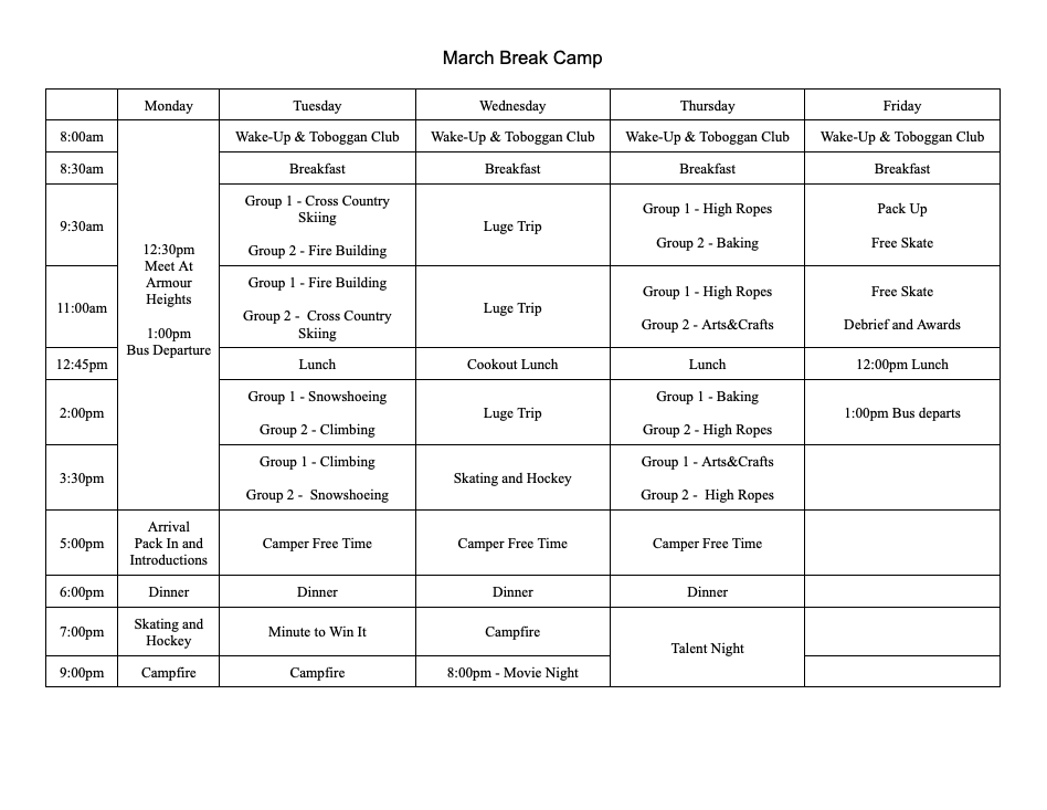 This is a sample schedule for March Break Camp. Activities will depend on availability and weather conditions.